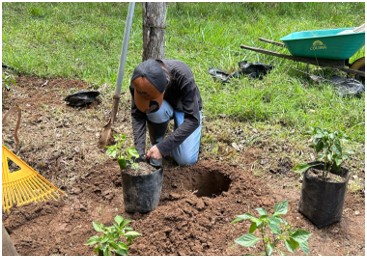 Estudiantes del programa de Ingeniería Agroindustrial de UNIMETA, realizaron una salida de campo al Parque Metropolitano María Lucía, en la cual se llevó a cabo la preparación de un terreno de 50 por 60 metros. La jornada inició con la limpieza de arvenses mediante el uso de una guadaña; posteriormente, se retiró el rastrojo con un rastrillo para despejar el área destinada a la siembra, se cavaron hoyos de aproximadamente 30 cm de profundidad, manteniendo una densidad de siembra de 40 cm entre plantas y 120 cm entre hileras. Finalmente, se ejecutó la siembra de las plantas de pimentón y se les aplicó agua a cada una de ellas.